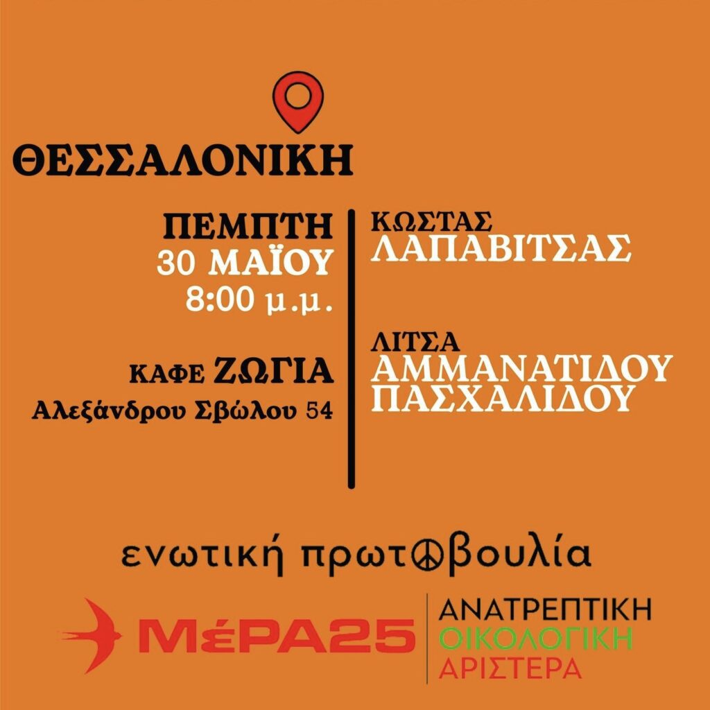 30/5: στις 20:00 υποψήφιες/υποψήφιοι της ενωτικής πρωτοβουλίας ΜέΡΑ25 | Ανατρεπτική Οικολογική Αριστερά θα βρίσκονται στη Θεσσαλονίκη.