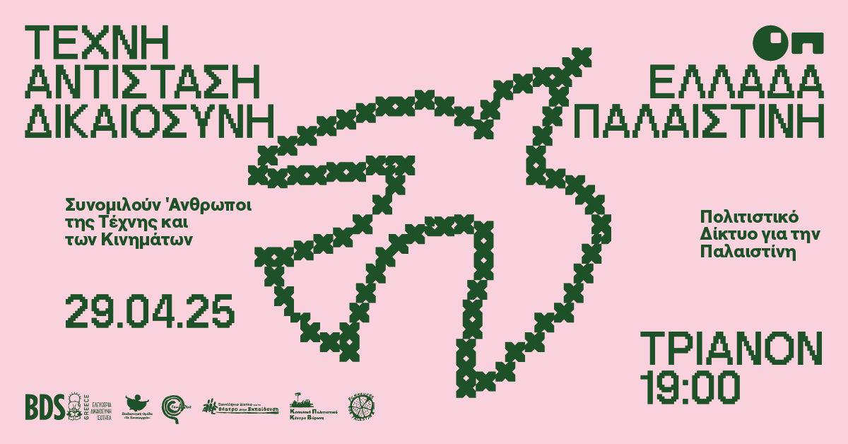 Η εκδήλωση θα πραγματοποιηθεί την Τρίτη 29 Απριλίου, ώρα 7μμ στον κινηματογράφο ΤΡΙΑΝΟΝ με τίτλο: Τέχνη – Αντίσταση – Δικαιοσύνη: Ελλάδα -Παλαιστίνη, Κάνοντας το αίτημα για δικαιοσύνη πράξη μέσα από την τέχνη
