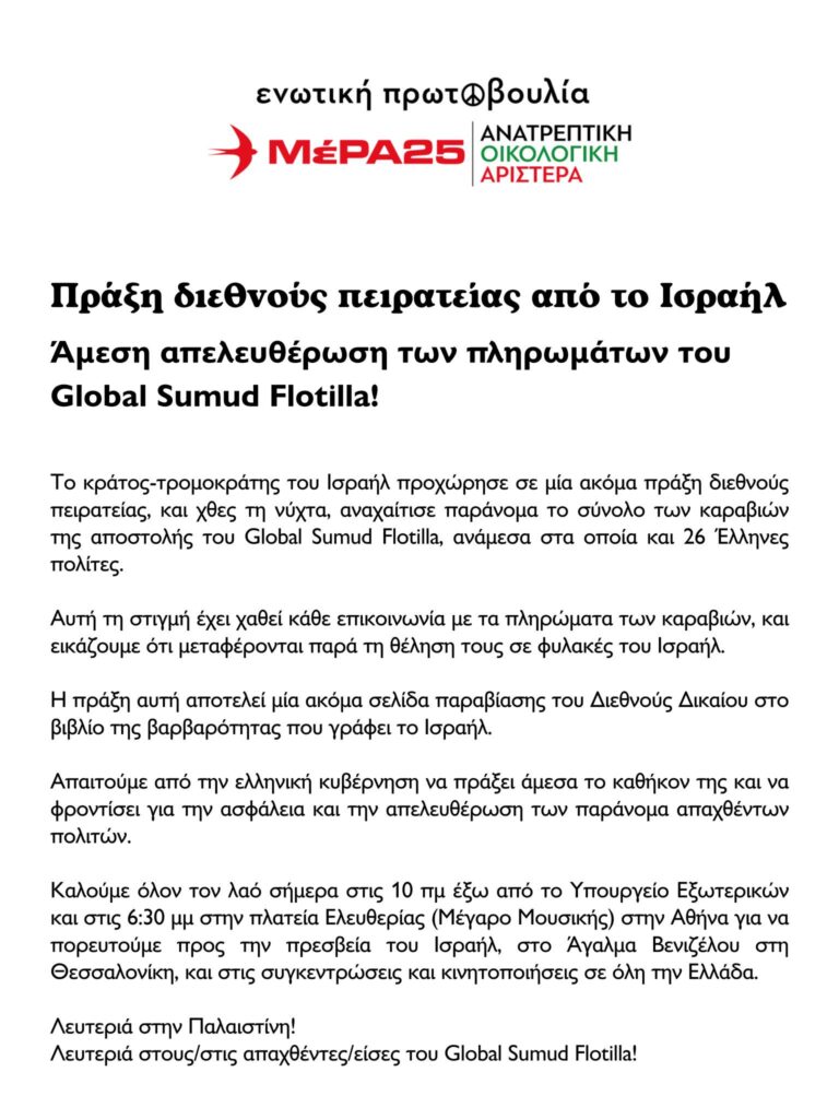 Το κράτος-τρομοκράτης του Ισραήλ προχώρησε σε μία ακόμα πράξη διεθνούς πειρατείας, και χθες τη νύχτα, αναχαίτισε παράνομα το σύνολο των καραβιών της αποστολής του Global Sumud Flotilla, ανάμεσα στα οποία και 26 Έλληνες πολίτες.