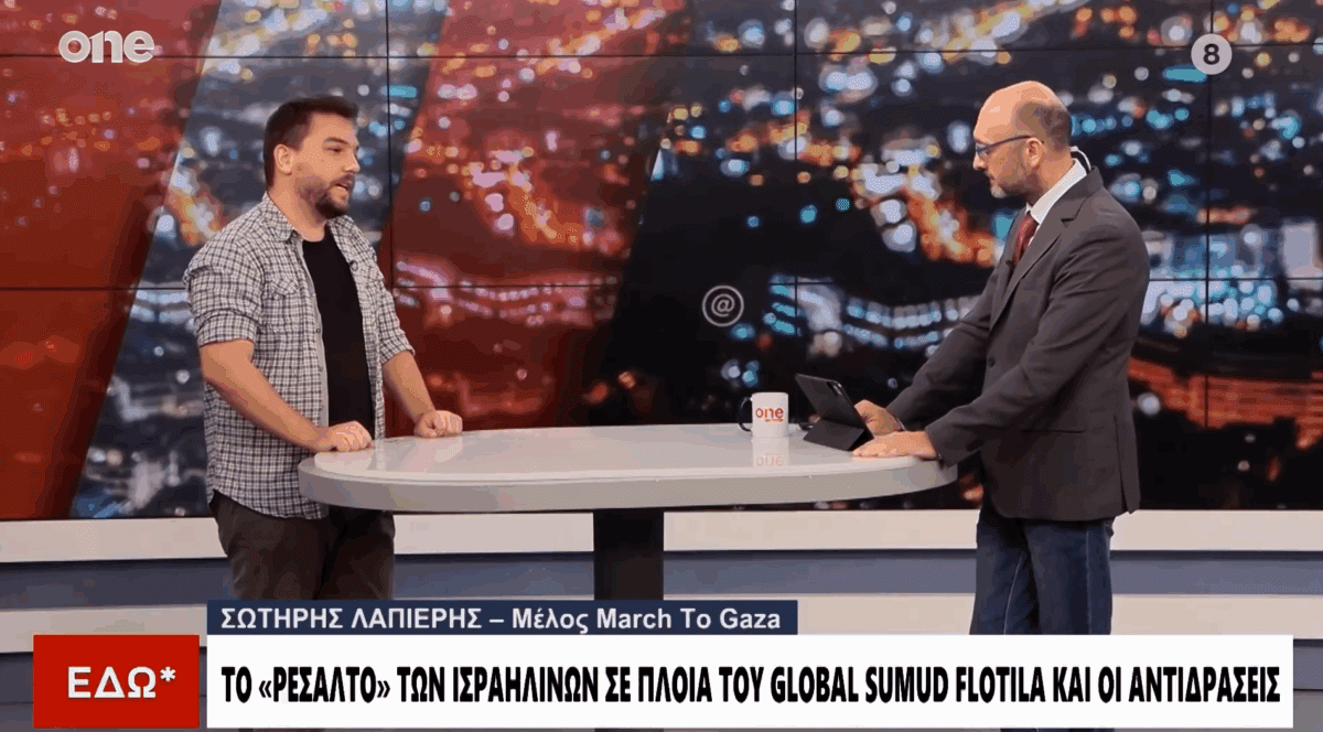 Παρέμβαση του Σωτήρη Λαπιέρη, μέλους της ελληνικής αποστολής του March to Gaza, μέλους του Πολιτικού Συμβουλίου της Λαϊκής Ενότητας – Ανυπότακτη Αριστερά και στελέχους της Ενωτικής Πρωτοβουλίας ΜέΡΑ25 – Ανατρεπτική Οικολογική Αριστερά, στην εκπομπή “ΕΔΩ*” του One Channel για την επίθεση του κράτους-δολοφόνου του Ισραήλ στο στόλο του Global Sumud Flotilla, την παράνομη, από κάθε άποψη διεθνούς δικαίου, αρπαγή των συμμετεχόντων στην αποστολή σε διεθνή ύδατα και τις ευθύνες της ελληνικής κυβέρνησης για την προστασία και την απελευθέρωση των Ελλήνων πολιτών που συμμετείχαν στην αποστολή