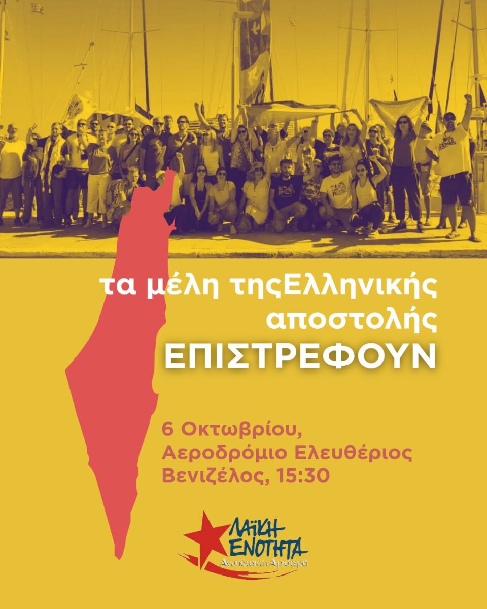 Τους υποδεχόμαστε με την υπόσχεση να συνεχίσουμε πιο αποφασιστικά τον αγώνα για να σπάσει ο παράνομος αποκλεισμός της Γάζας, να σταματήσει η γενοκτονία του παλαιστινιακού λαού και να ηττηθεί το φρικιαστικό σχέδιο εθνοκάθαρσης και εξόντωσης που υλοποιεί το κράτος – τρομοκράτης του Ισραήλ.