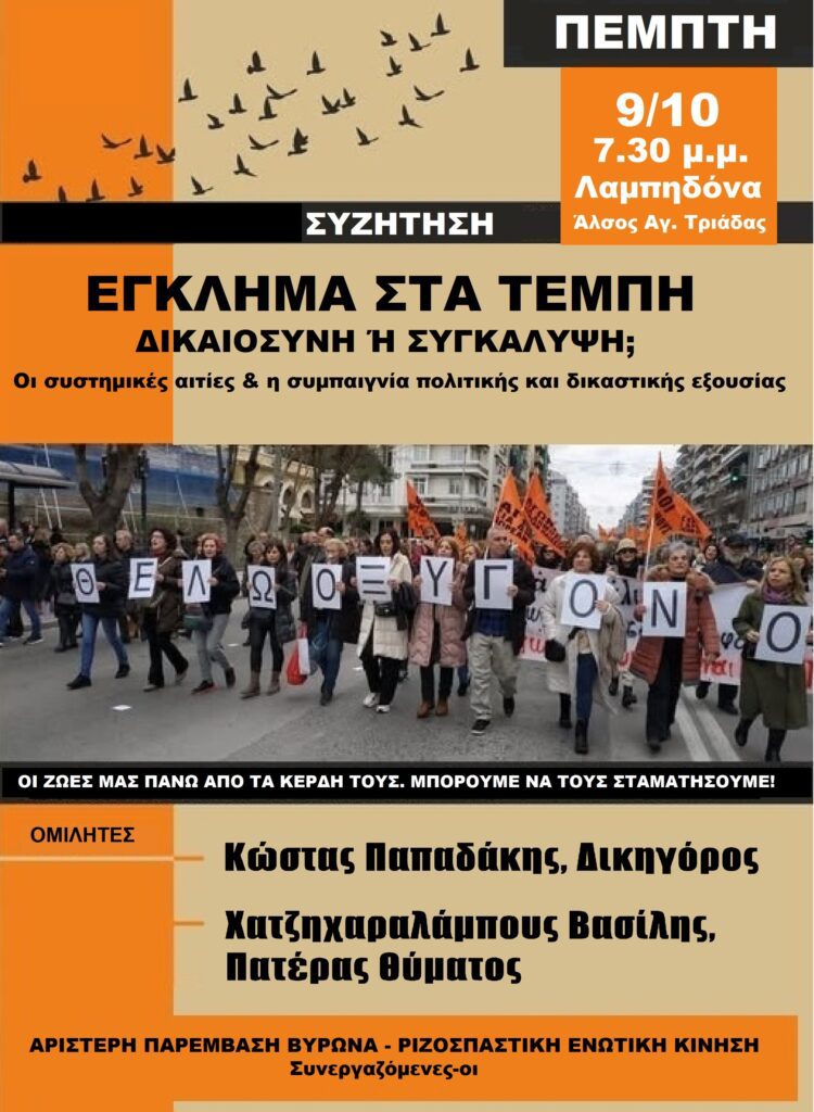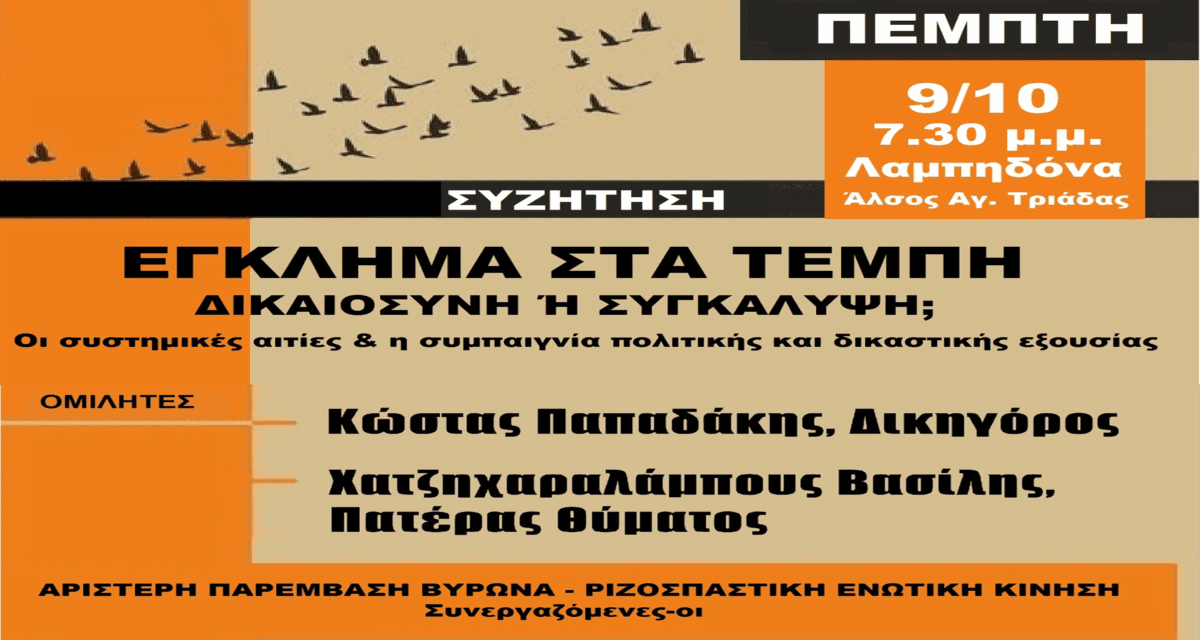 Πέμπτη 9/10, 7.30 μ.μ. συζήτηση “Έγκλημα στα Τέμπη. Δικαιοσύνη ή συγκάλυψη;” με Κώστα Παπαδάκη και Βασίλη Χατζηχαραλάμπους