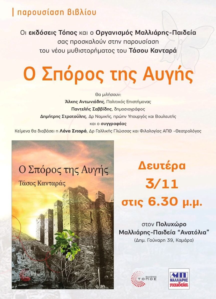 Οι εκδόσεις Τόπος και ο Οργανισμός Μαλλιάρης-Παιδεία σας προσκαλούν στην παρουσίαση του νέου μυθιστορήματος του Τάσου Κανταρά