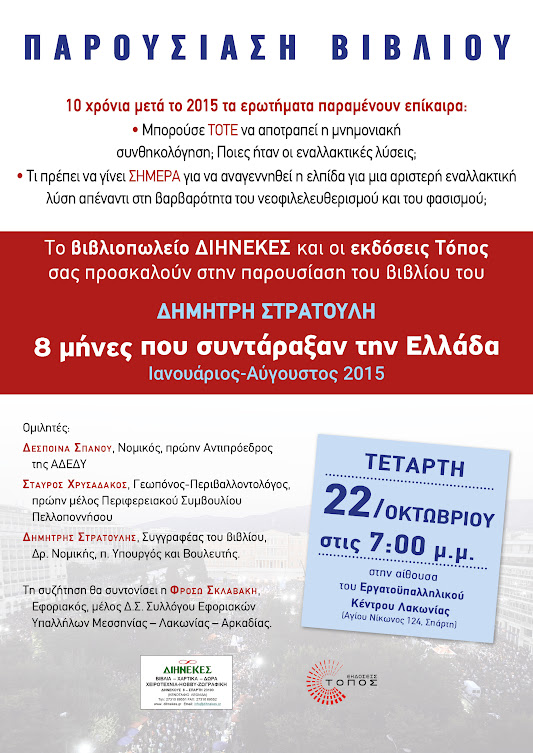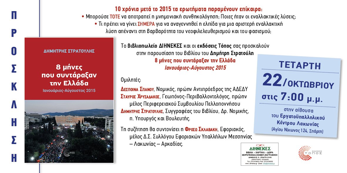 Το βιβλιοπωλείο ΔΙΗΝΕΚΕΣ και οι εκδόσεις ΤΟΠΟΣ σας καλούμε στην παρουσίαση στη ΣΠΑΡΤΗ, του βιβλίου του Δημήτρη Στρατούλη:
