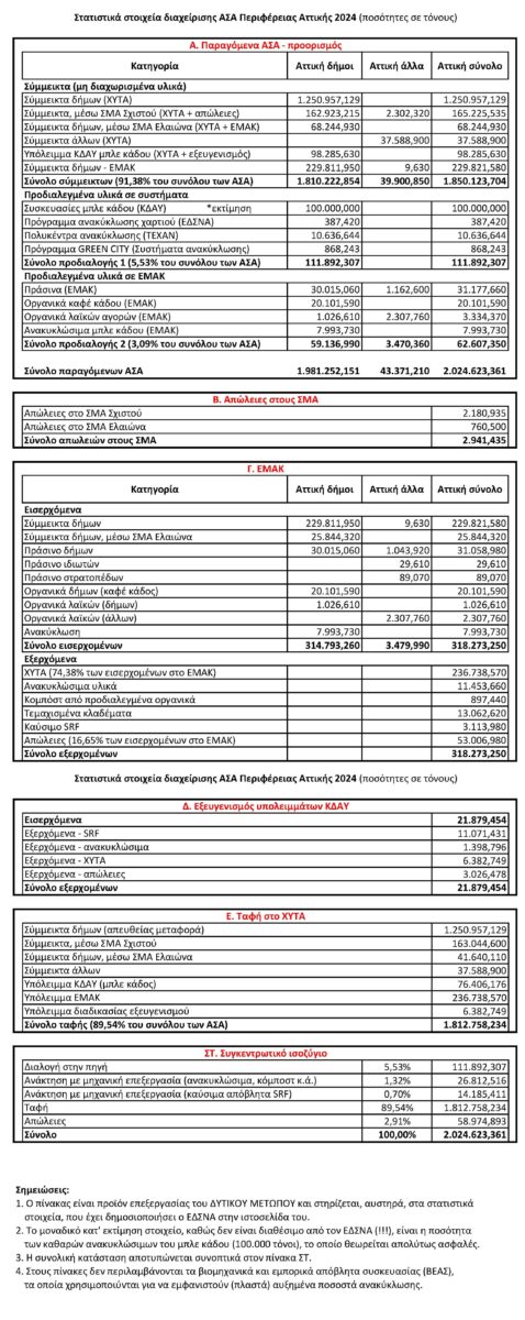 Δεν υπάρχει πιο χαρακτηριστικό παράδειγμα, από αυτό της περιφέρειας Αττικής, η οποία παράγει και διαχειρίζεται το 40% του συνόλου των αστικών στερεών αποβλήτων (ΑΣΑ) της χώρας, μέσω των κατά καιρούς φορέων διαχείρισης (παλιότερα του ΕΔΣΚΝΑ, μετά και μέχρι σήμερα του ΕΔΣΝΑ). Ως ΔΥΤΙΚΟ ΜΕΤΩΠΟ, θα προσπαθήσουμε να τεκμηριώσουμε τον παραπάνω ισχυρισμό, δημοσιοποιώντας σήμερα -όπως κάνουμε, σχεδόν, κάθε χρόνο- τα στατιστικά στοιχεία της διαχείρισης των ΑΣΑ της Αττικής για το 2024, στηριγμένοι στα επίσημα στοιχεία του ΕΔΣΝΑ, με απόλυτη ακρίβεια.