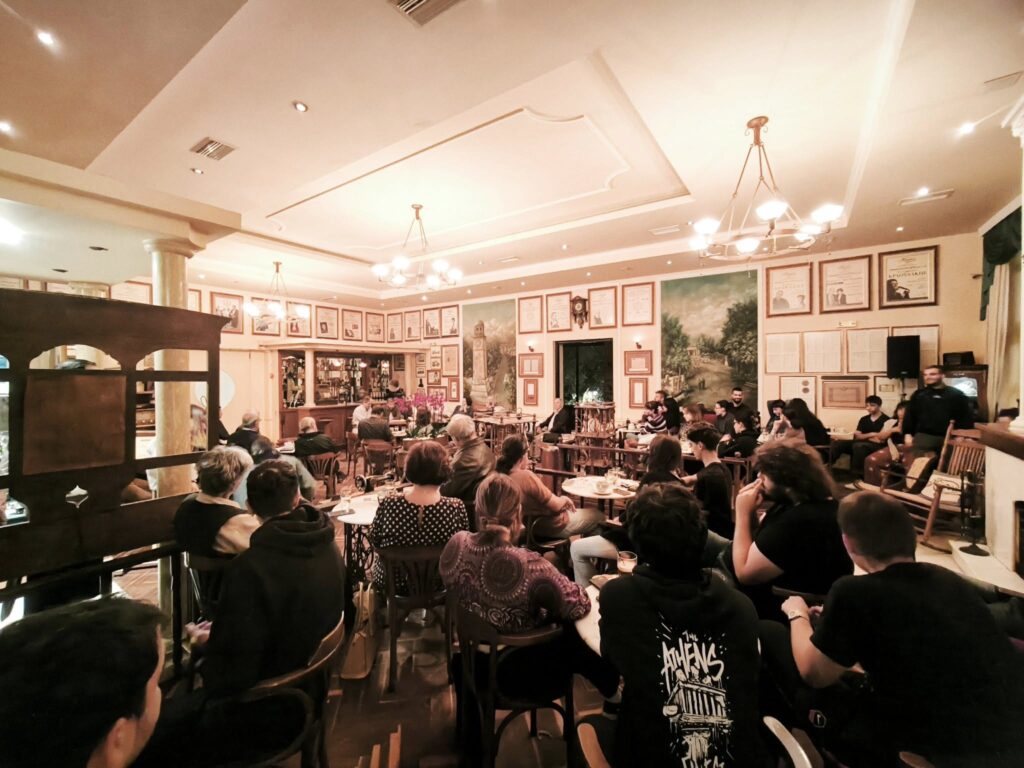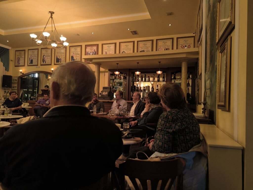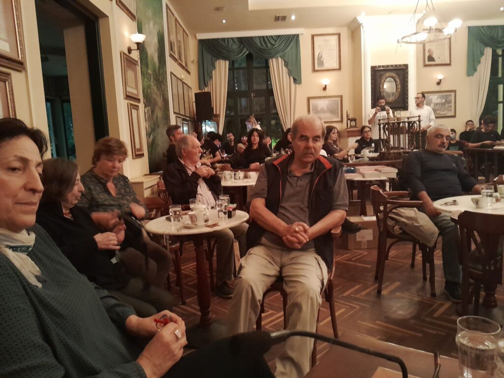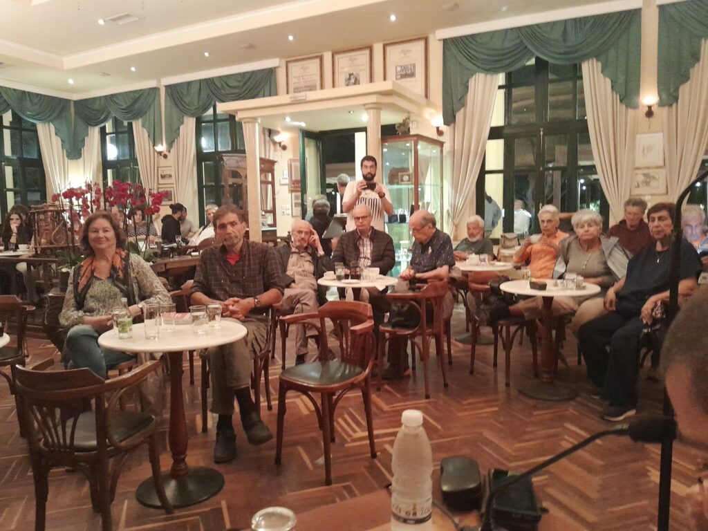 Η εκδήλωση έγινε την Δευτέρα, 20 Οκτωβρίου 2025, στις 7:00 μμ, στο φιλόξενο ΚΗΠΟΣ ΚΑΦΕ, με μεγάλη επιτυχία και μαζική νεανική συμμετοχή. Έγινε πλούσια και γόνιμη συζήτηση, κυρίως, για το πως θα ξαναγεννηθεί η ελπίδα για μια αριστερή εναλλακτική διέξοδο απέναντι στη σημερινή νεοφιλελεύθερη βαρβαρότητα, στην επέλαση της ακροδεξιάς και στον κίνδυνο του πολέμου.
