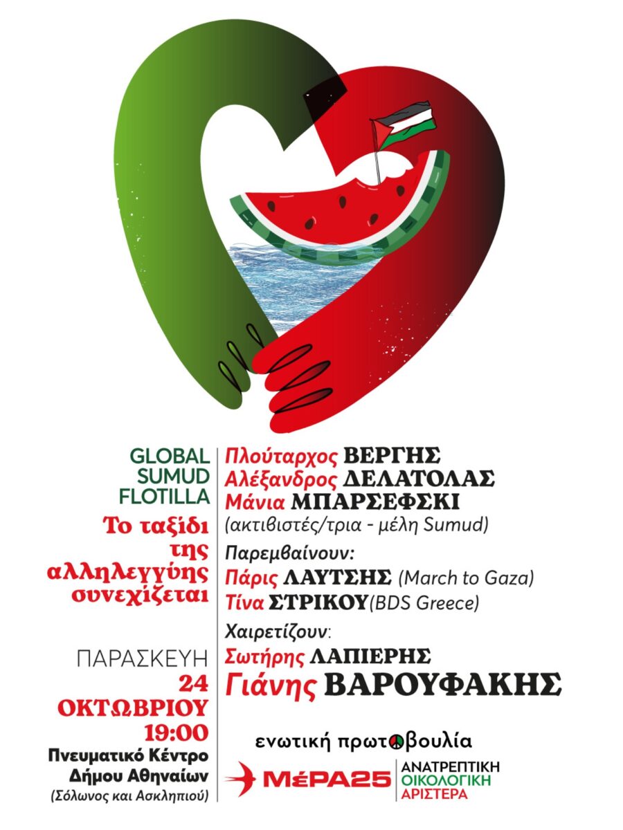 Η ενωτική πρωτοβουλία ΜέΡΑ25 | Ανατρεπτική Οικολογική Αριστερά διοργανώνει εκδήλωση, με θέμα «Global Sumud Flotilla: Το ταξίδι της αλληλεγγύης συνεχίζεται» την Παρασκευή, 24 Οκτωβρίου, στις 19:00, στο Πνευματικό Κέντρο Δήμου Αθηναίων (Σόλωνος και Ασκληπιού).