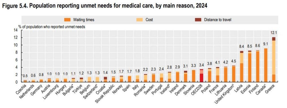 Όσον αφορά την κάλυψη των υπηρεσιών, κατά μέσο όρο στις 28 χώρες του ΟΟΣΑ με συγκρίσιμα στοιχεία, μόνο το 3,4% του πληθυσμού ανέφερε ότι δεν κατάφερε να έχει πρόσβαση σε υπηρεσίες υγείας λόγω κόστους, απόστασης ή χρόνων αναμονής το 2024. Ωστόσο, το 12,1%% του πληθυσμού ανέφερε ανεκπλήρωτες ανάγκες στην Ελλάδα, στον Καναδά (9,1%), στη Φινλανδία (8,6%), στην Εσθονία (8,5%) και στη Λετονία (8,4%). Το κυριότερο πρόβλημα για τις ανεκπλήρωτες ανάγκες στην Ελλάδα όπως φαίνεται στον σχετικό πίνακα ήταν οι μεγάλες αναμονές σε αντίθεση με τις άλλες χώρες που ανέφεραν το κόστος των ιατρικών υπηρεσιών.