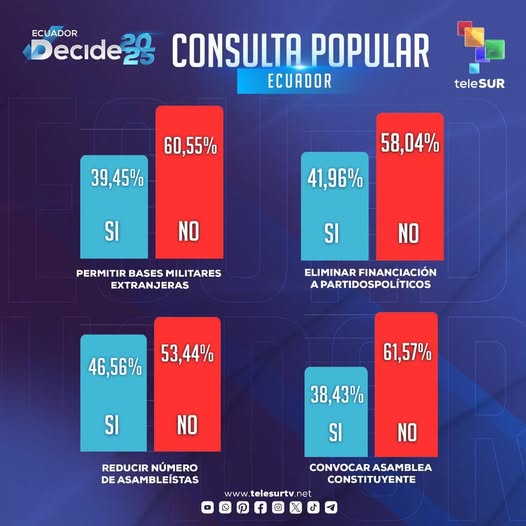 Η απόρριψη του δημοψηφίσματος που προώθησε ο ολιγάρχης, τραμπιστής, πρόεδρος του Ισημερινού, Ντανιέλ Νομπόα, παγιώνεται, καθώς έχει καταμετρηθεί πάνω από το 98% των ψήφων, σε αυτό που έχει μετατραπεί σε σοβαρή ήττα για την κυβέρνηση, αλλά και για το « αναβαθμισμένο» δόγμα Μονρόε της Ουάσιγκτον!
