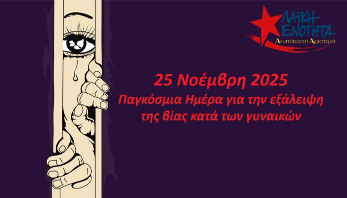 Η Λαϊκή Ενότητα – Ανυπότακτη Αριστερά απαιτεί ουσιαστικά μέτρα ενάντια στην βία κατά των γυναικών και στηρίζει τις διαδηλώσεις των συνδικάτων που πραγματοποιούνται την Τρίτη 25 Νοεμβρίου σε όλη την Ελλάδα.